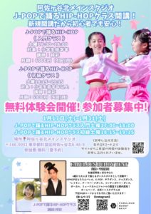 2/21日(土)スタート 「J-POPで踊るHIPHOP入門クラス」これからスタートするクラスなのでこちらも初心者にはぴったりで、流行りのJ-POPで楽しく踊るクラスです。